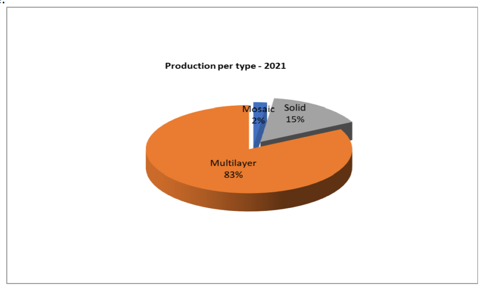 La produzione totale di parquet 2021 per tipologia rimane simile al quadro già presentato dal 2010 in poi: il multistrato è primo con l’83% (contro l’82% del 2020), seguito dal massello (compreso il lamparquet) con il 15% (contro il 16 % nel 2020) e mosaico con un 2% stabile della torta totale.