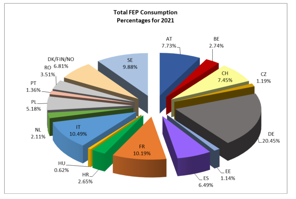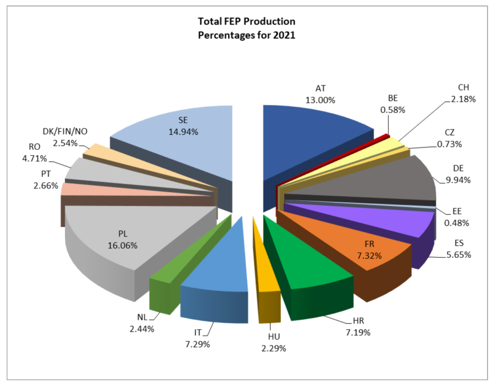 La produzione totale nel territorio FEP è aumentata significativamente (+6,92%) nel 2021 a un volume di 82.624.000 m². Tenere conto della produzione totale in Europa (paesi FEP + paesi non FEP in Europa) implica che la produzione nel 2021 è aumentata del 7,88% e ha raggiunto quasi 98 milioni di m².