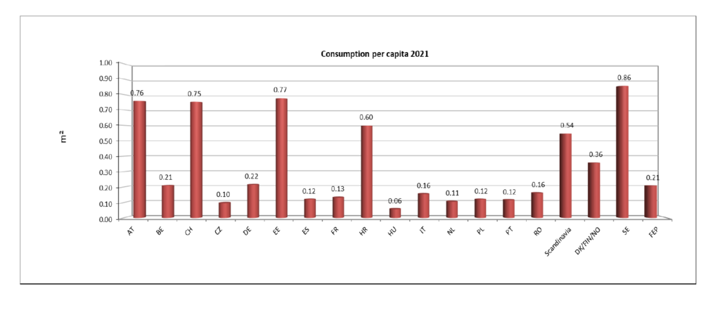Per quanto riguarda il consumo pro capite di parquet, la Svezia mantiene il primo posto (0,86 mq), davanti a Estonia (0,77 mq), Austria (0,76 mq) e Svizzera (0,75 mq). Nell’area totale FEP, il consumo per abitante aumenta leggermente a 0,21 m² nel 2020 e nel 2021.