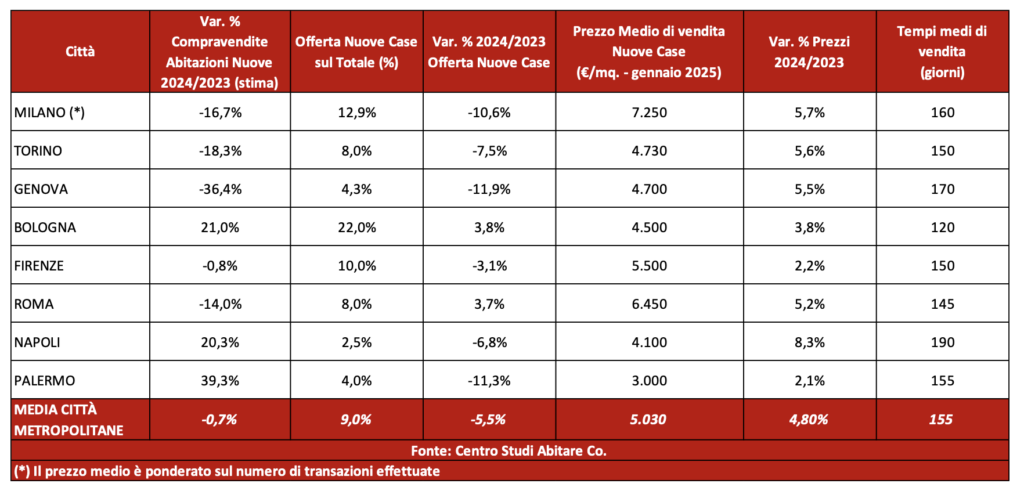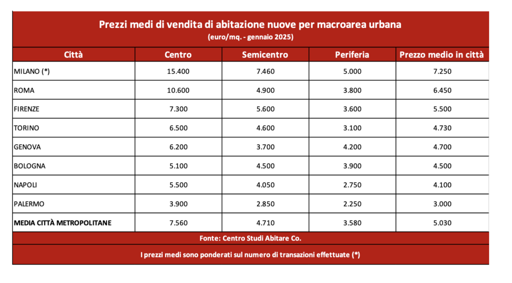 Ma se in alcune città le compravendite delle nuove abitazioni sono calate, i prezzi medi continuano a crescere (+4,8% rispetto al 2023), raggiungendo un valore medio generale di 5.030 € al mq, ma con nette differenze tra zone centrali (7.560 € al mq.), semicentrali (4.710 € al mq.) e periferiche (3.580 € al mq.).