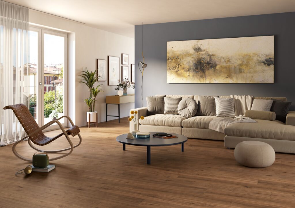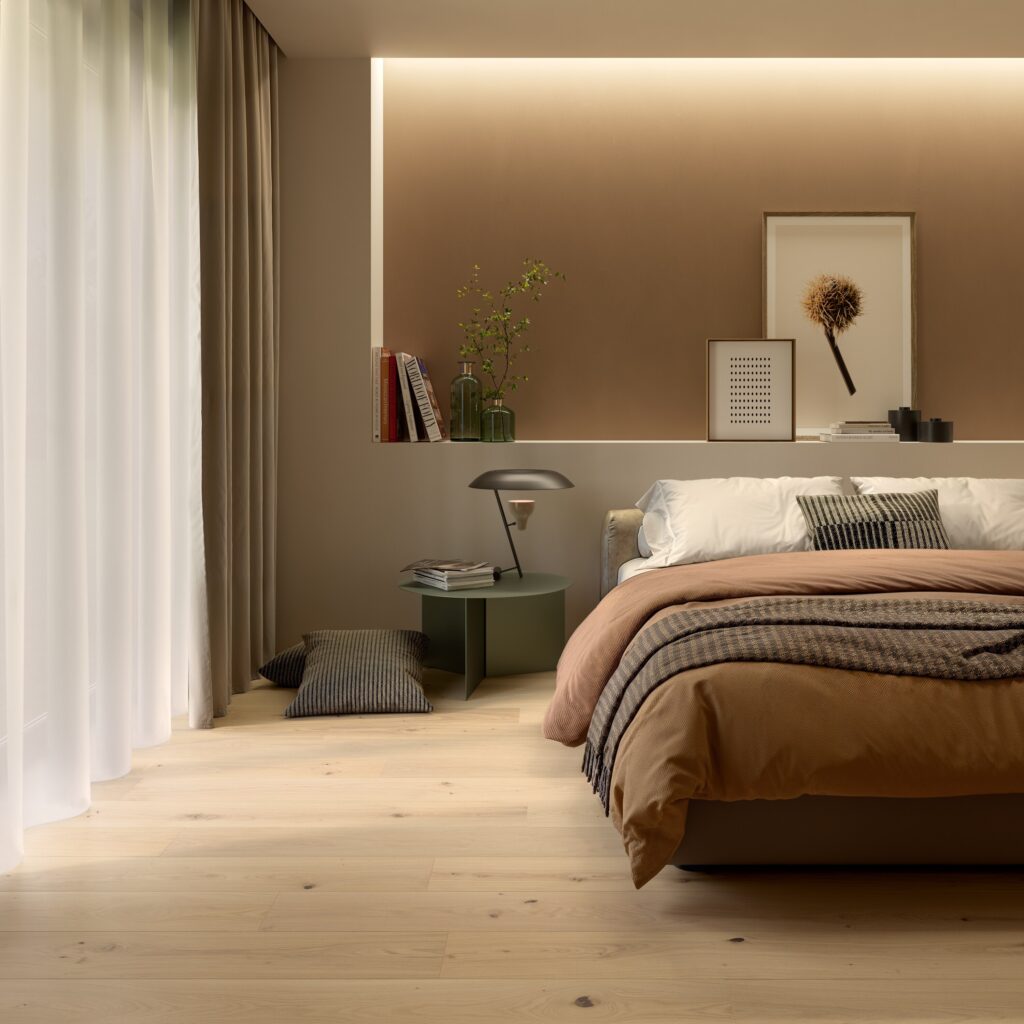 Le dieci proposte della collezione, tutte in Rovere Europeo ad eccezione di una new entry in Noce Americano, si distinguono per le tavole di grandi dimensioni (1800/1900 x 180/190 mm) con superficie spazzolata, bisellata sui quattro lati e rifinita con vernice opaca completamente atossica e sicura sia per le persone che per l’ambiente.