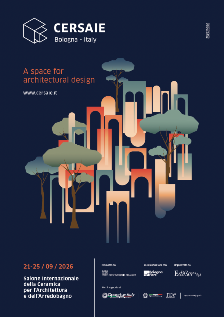 L’immagine di Cersaie 2026, ideata da Interpromex Comunicazione, racconta così un luogo aperto al dialogo, in cui architettura e natura si rigenerano reciprocamente.