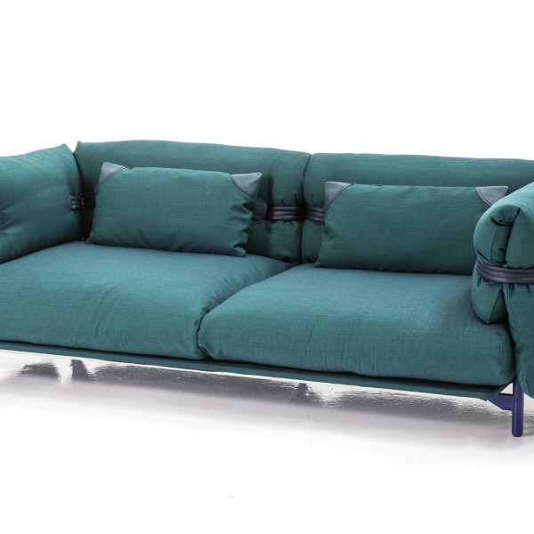 Una cinghia di maglia riunisce, come in un abbraccio, i cuscini dello schienale e del bracciolo. ...