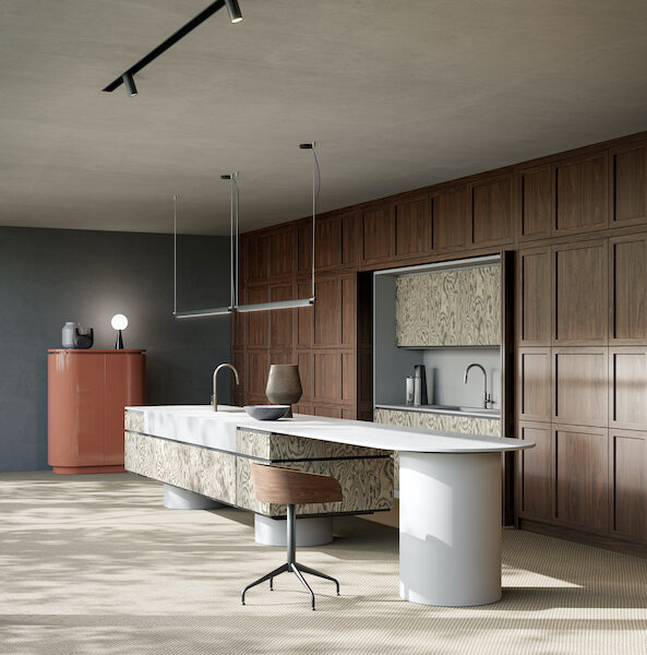 Un’isola cucina, un sistema di boiserie, una madia, uno sgabello. La configurazione del...