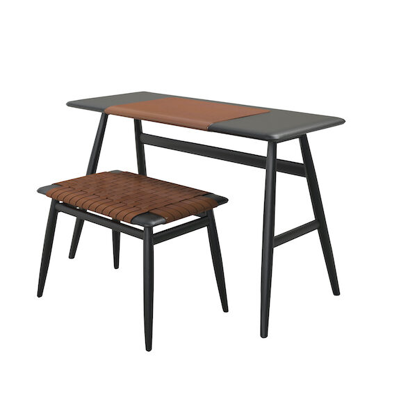 La scrivania e lo sgabello Mo Bridge abbinano volumi puri in acciaio, legno massello di n...