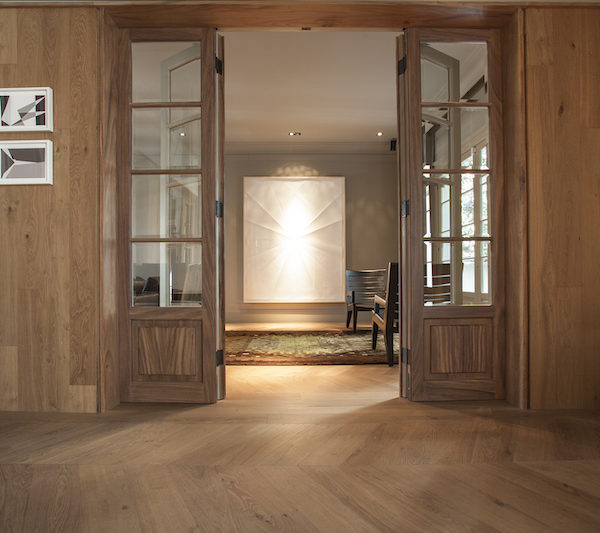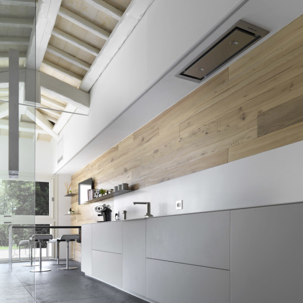 L’architetto Massimo Broglio ha creato per Corà ContinuumFloor, boiserie composta da listoni v...