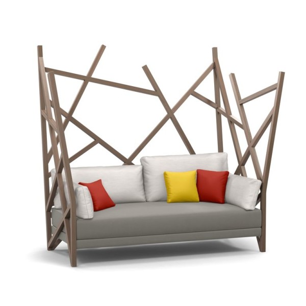 Il divano a baldacchino Saga di Roche Bobois ha struttura in acacia massiccio finita a olio. Corn...