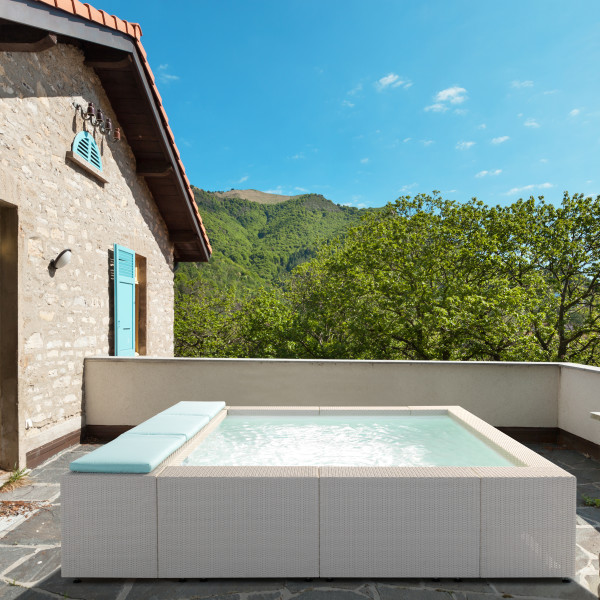 Le fibre tessute a mano che rivestono le piscine e i morbidi cuscini sono impermeabili e studiati...